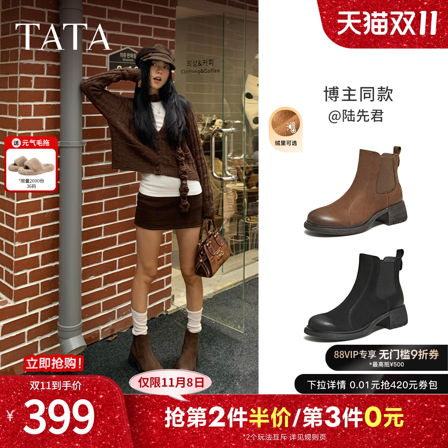 TATA他她靴子2025冬羊皮切尔西靴英伦风加绒短靴显瘦女鞋7C844DD5