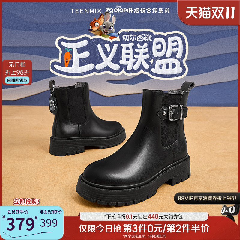 天美意厚底英伦切尔西靴烟筒靴女鞋冬新款加绒短靴子皮靴BE091DD2