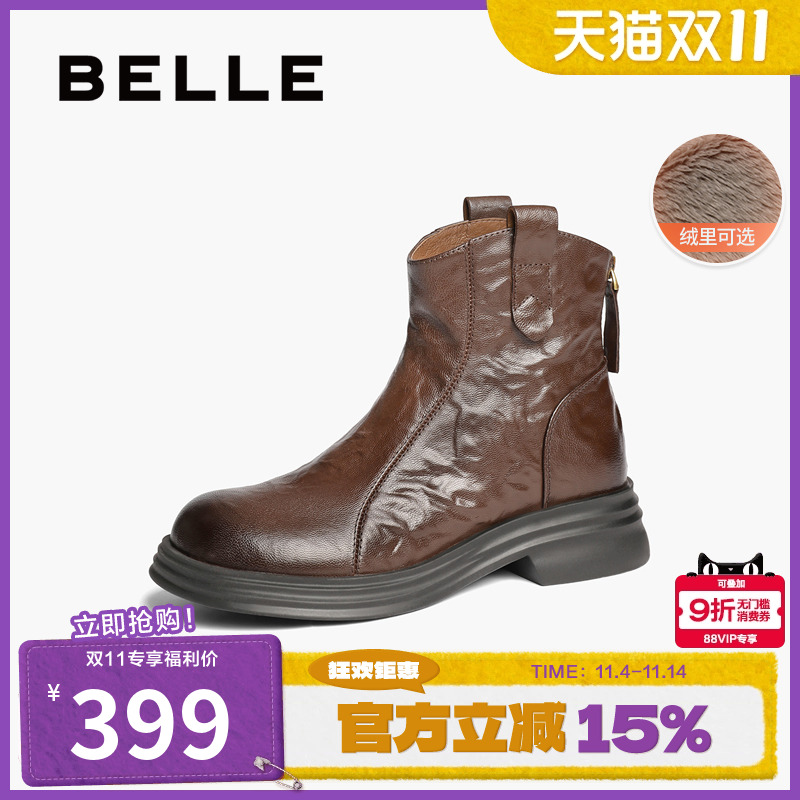 百丽复古加绒时装靴女冬新羊皮褶皱切尔西靴显瘦瘦短靴子D4L1DDD4