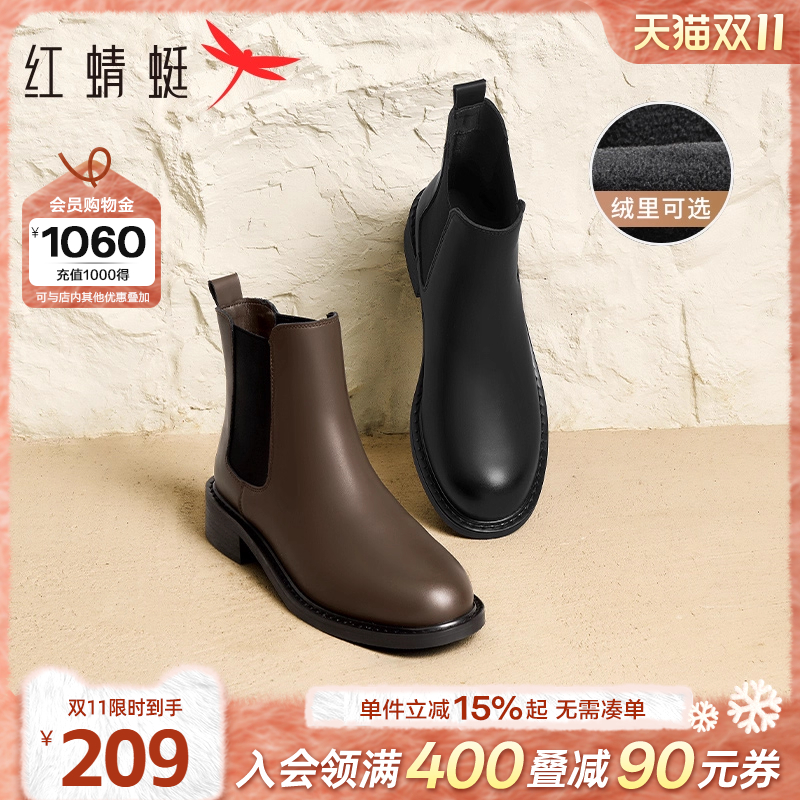 红蜻蜓切尔西靴女款秋冬新款靴子加绒显瘦烟筒靴英伦粗跟休闲女靴