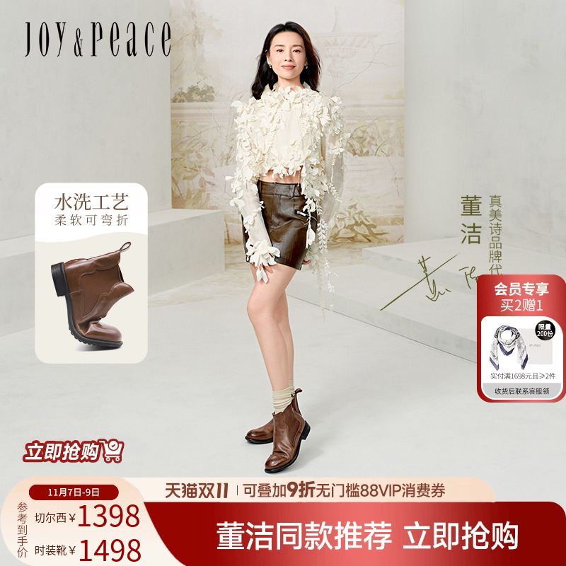 董洁同款真美诗自由诗2025冬季水洗牛皮棕色西部靴切尔西靴短靴女