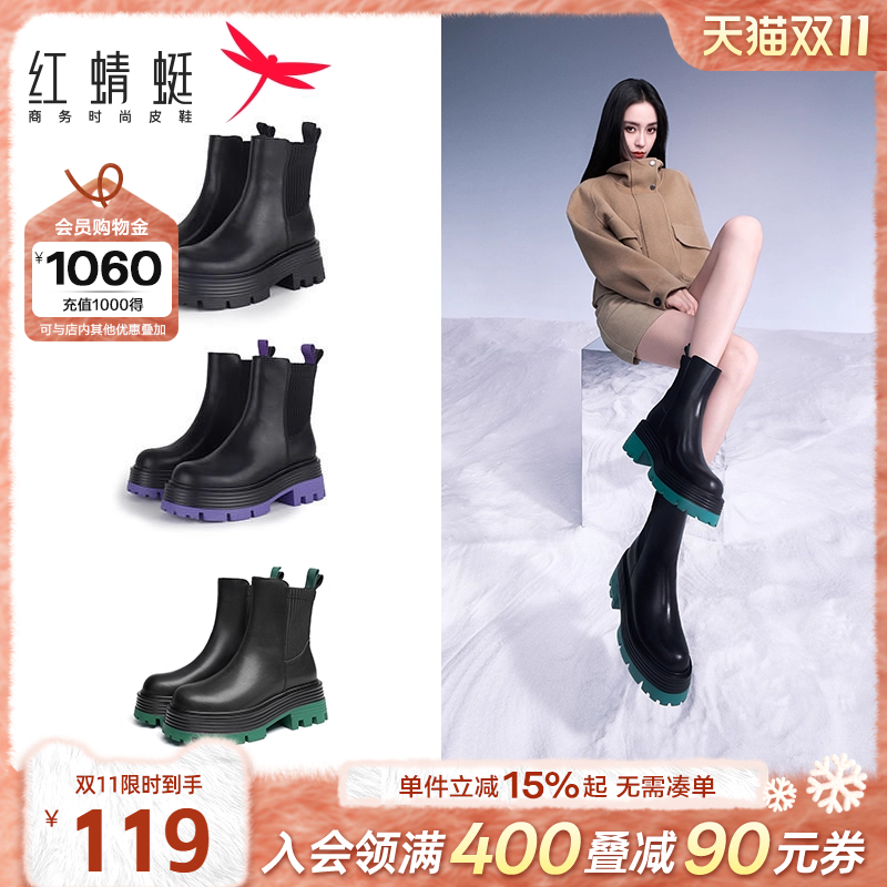 红蜻蜓Angelababy同款切尔西靴女秋冬新款烟筒厚底增高短靴松紧带