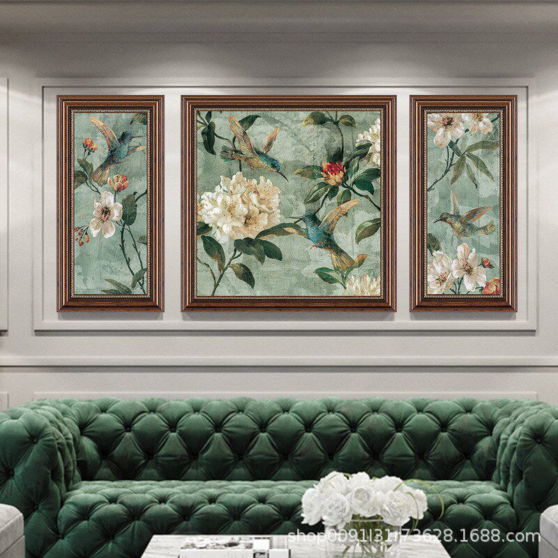 美式乡村客厅装饰画沙发背景墙挂画欧式复古大气壁画简美花鸟三联