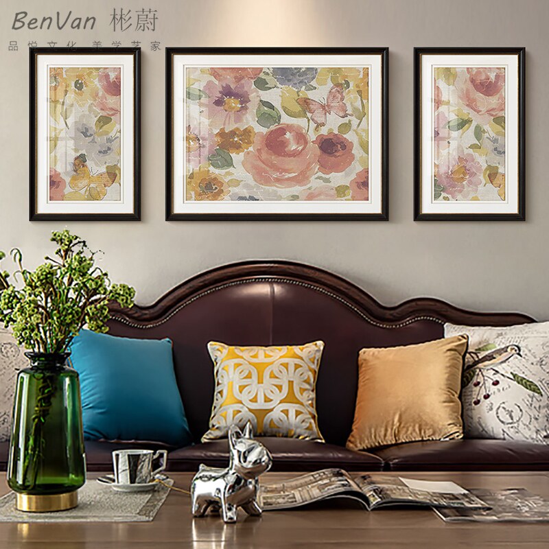 现代简美客厅沙发背景墙装饰画美式乡村花卉挂画墙画轻奢餐厅壁画