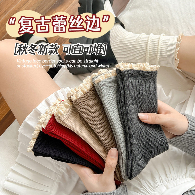 花边袜子女秋冬中筒ins潮纯色棉袜 女士灰色格雷系长筒堆堆袜