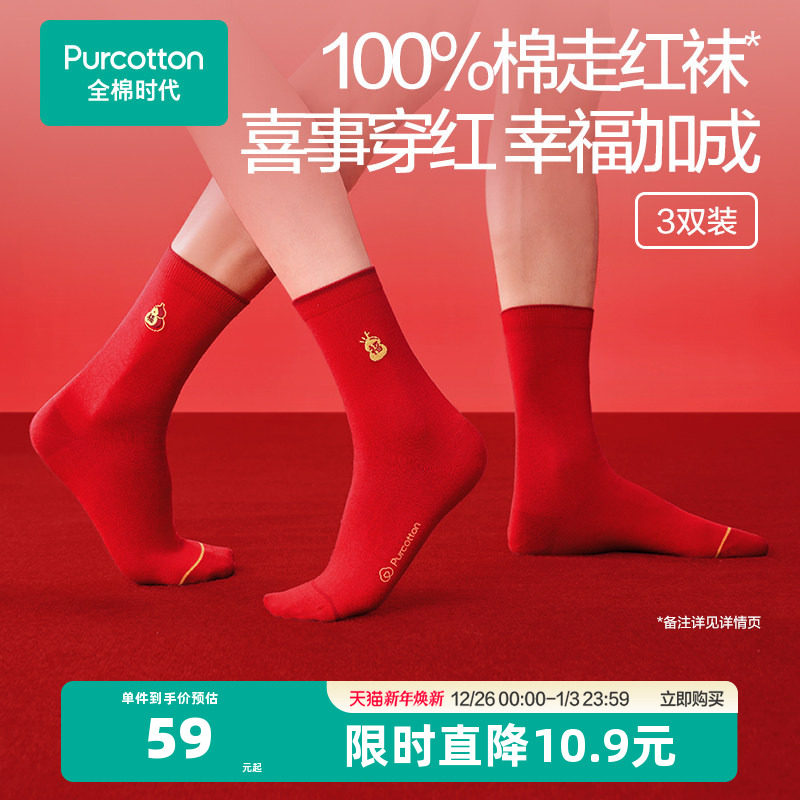 全棉时代男女士红袜子马年本命年纯棉袜新年袜3双100%棉中筒袜