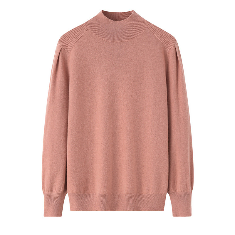 阿绒源100山羊绒灯笼袖女套衫半高领橡皮粉针织衫宽松贴身穿毛衣