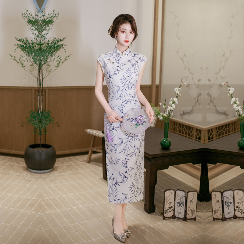 白色旗袍高级感年轻款水墨画妈妈春夏季女装连衣裙日常穿复古国风