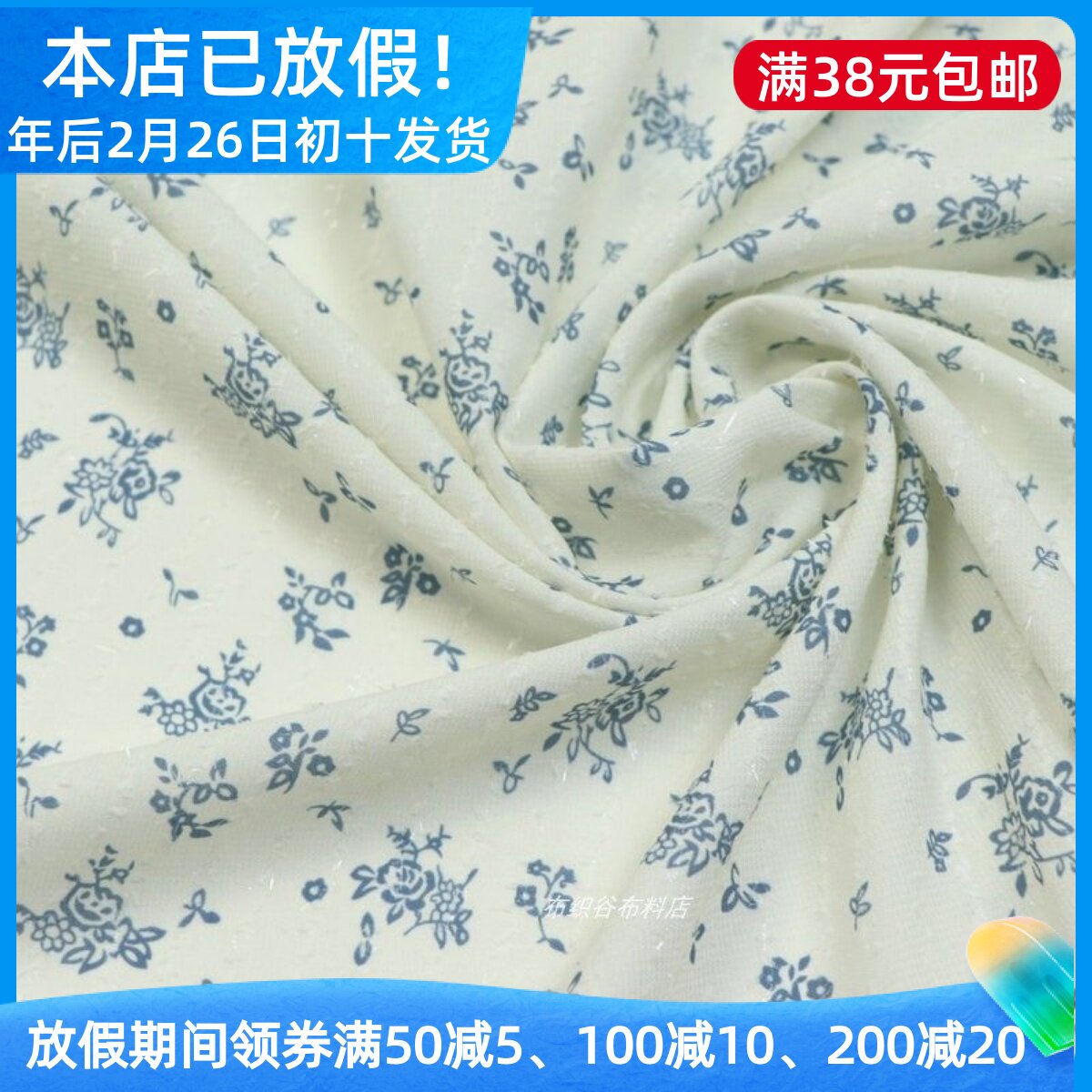 田园灰白色钩线条纹蓝碎花雪纺布料夏季女装连衣裙子汉服DIY面料