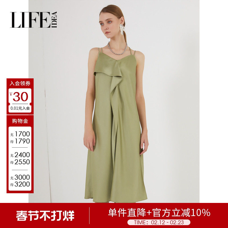 莱芙艾迪儿品牌女装荷叶边设计感纯色吊带裙女气质时尚连衣裙夏季