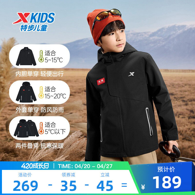 特步童装儿童外套男童冬季三合一加厚冬装运动风衣户外防风上衣男
