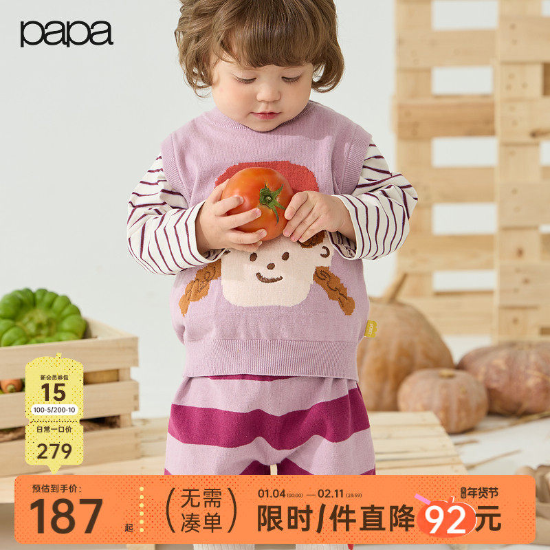 【新品】papa爬爬秋季婴儿套装男女宝卡通马甲背心条纹裤子两件套