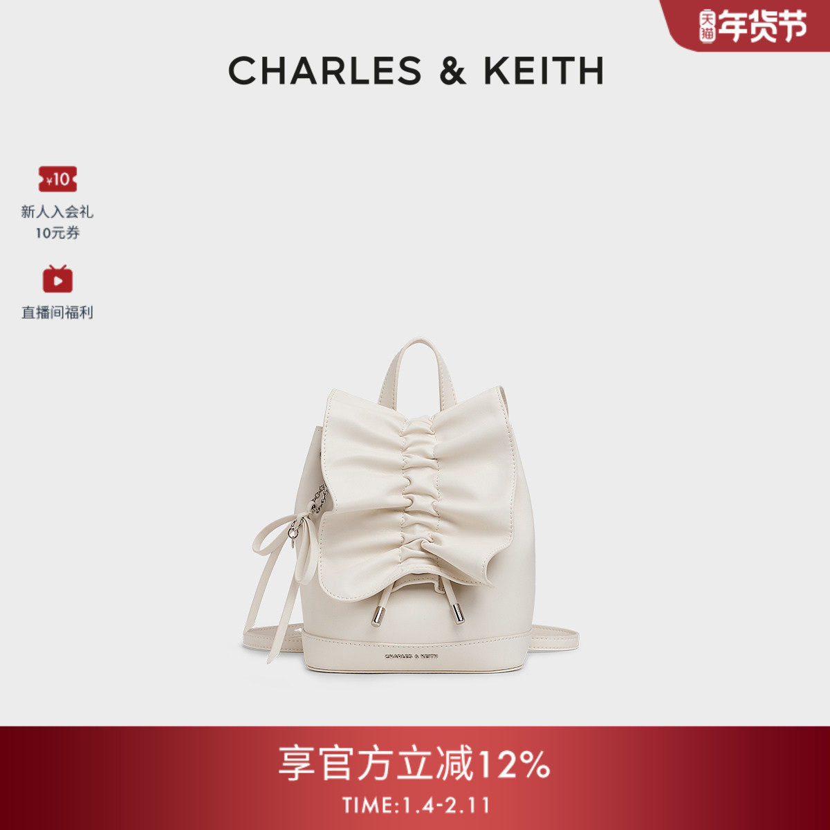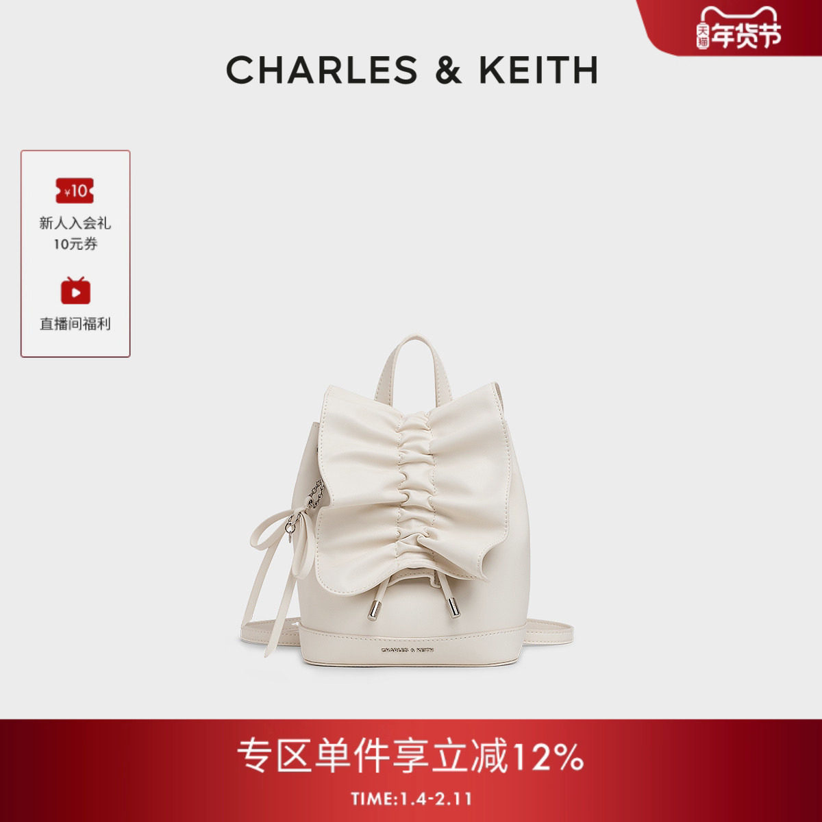 CHARLES&KEITH25秋冬CK2-60151552褶皱包盖蝴蝶结包挂双肩背包女
