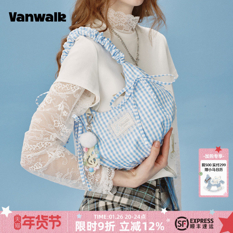 VANWALK happy band新款少女芭蕾风手提单肩包蕾丝蝴蝶结腋下包包