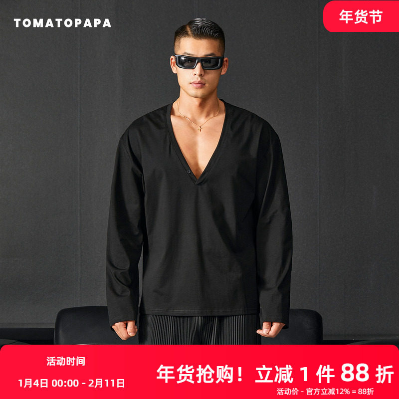 TOMATOPAPA男士长袖T恤V领低领口性感运动健身跑步套头衫打底休闲