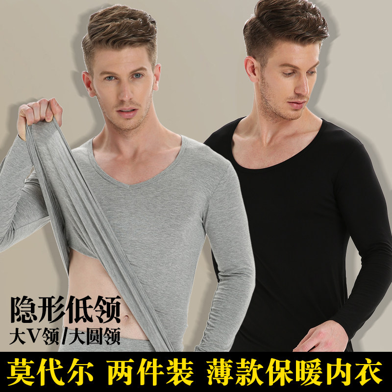 超低领莫代尔保暖内衣男薄款秋衣秋裤套装上衣紧身长袖隐形打底衫