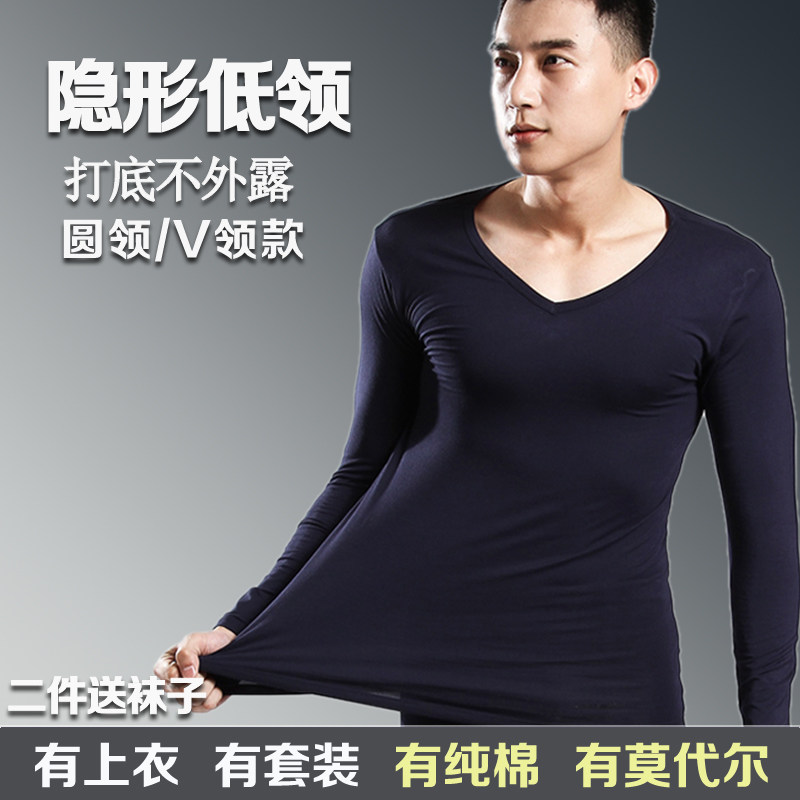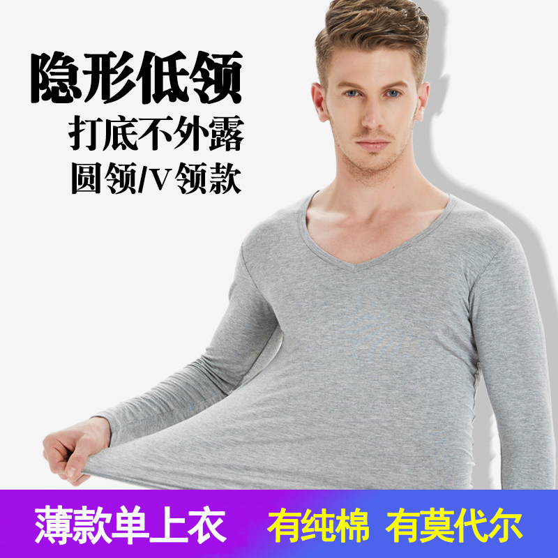 男士低领内衣秋衣打底衫长袖薄款秋冬纯棉大圆领莫代尔大V领上衣