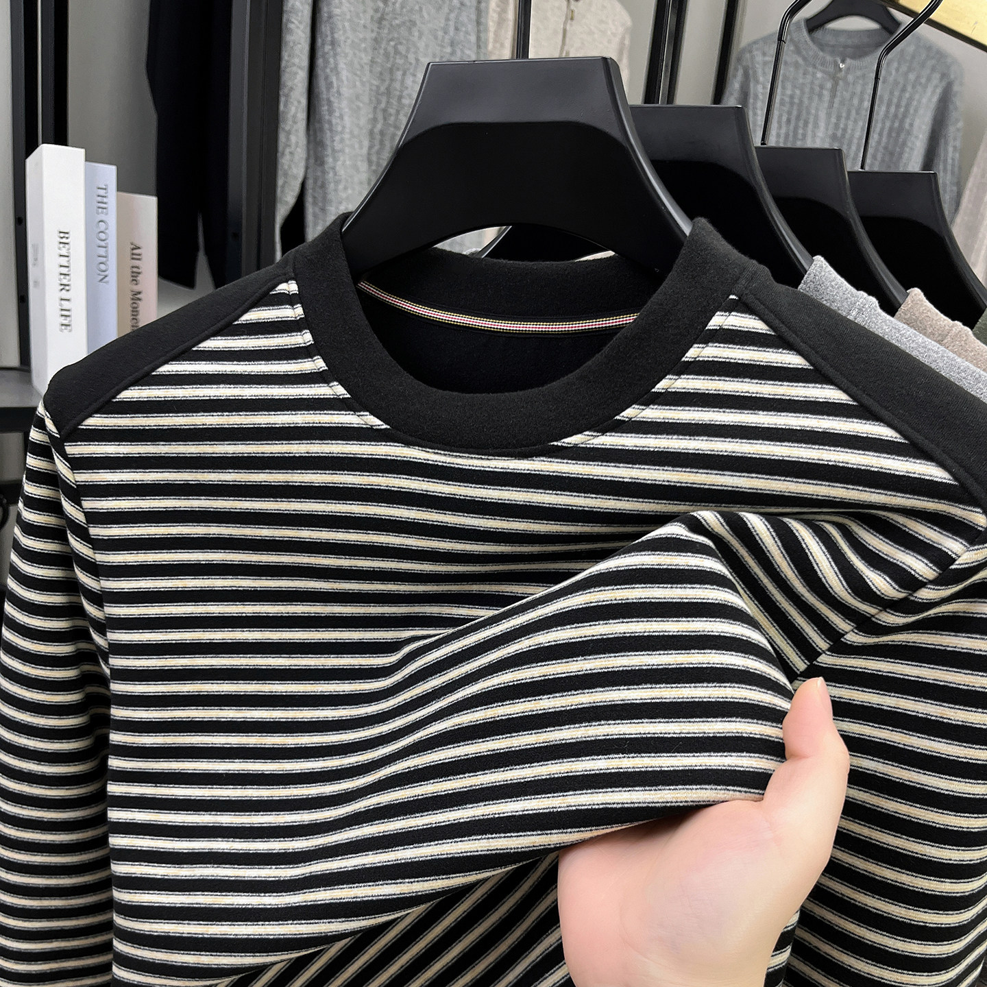 双面绒圆低领长袖T恤男士秋冬季保暖条纹打底衫上衣休闲套头卫衣