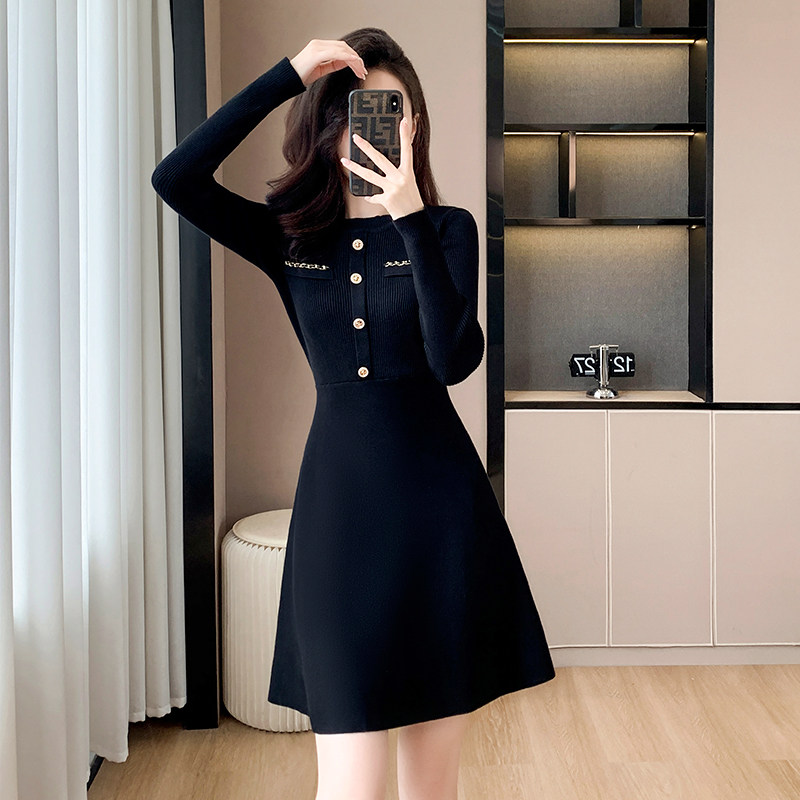 春秋季新款针织连衣裙女小香风收腰显瘦名媛气质内搭黑色打底裙子