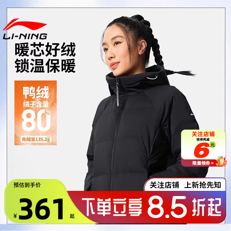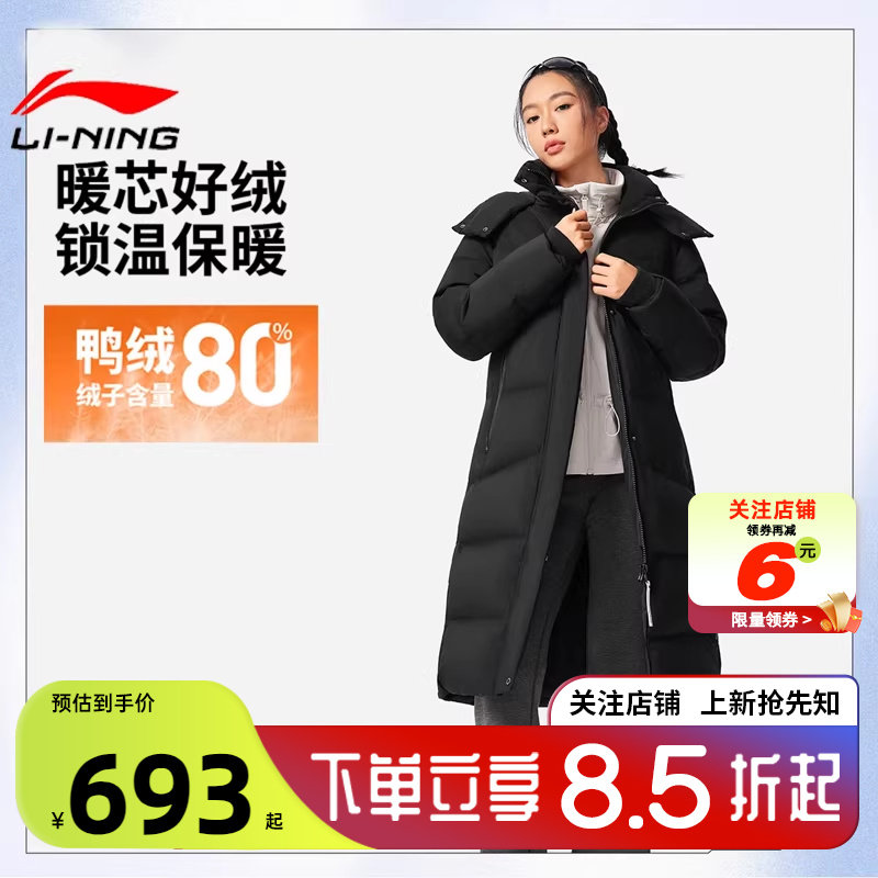 李宁羽绒服女款冬季正品防跑绒鸭绒保暖宽松女子连帽长款黑色外套