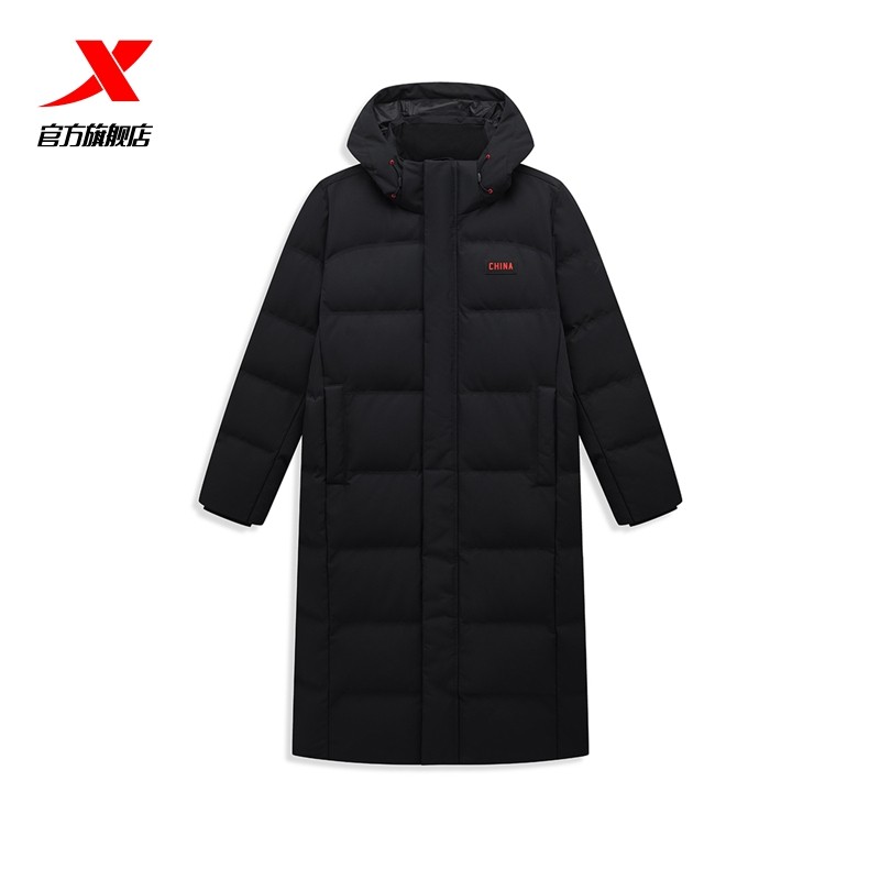 特步中长款羽绒服男款官方旗舰冬季新款黑色加绒加厚保暖运动外套