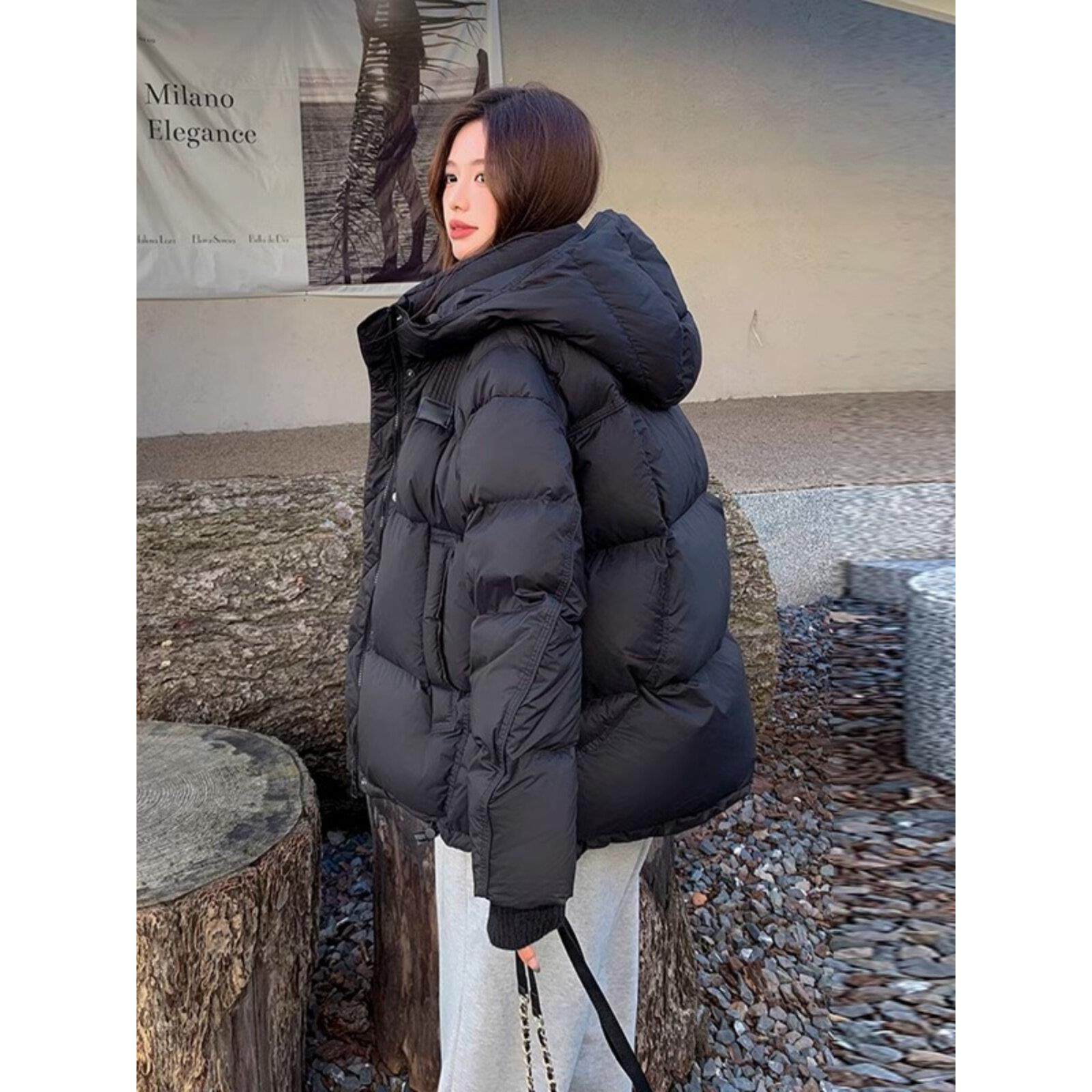 羽绒服女子韩版面包服宽松收腰显瘦黑色加厚休闲连帽外套优构良品