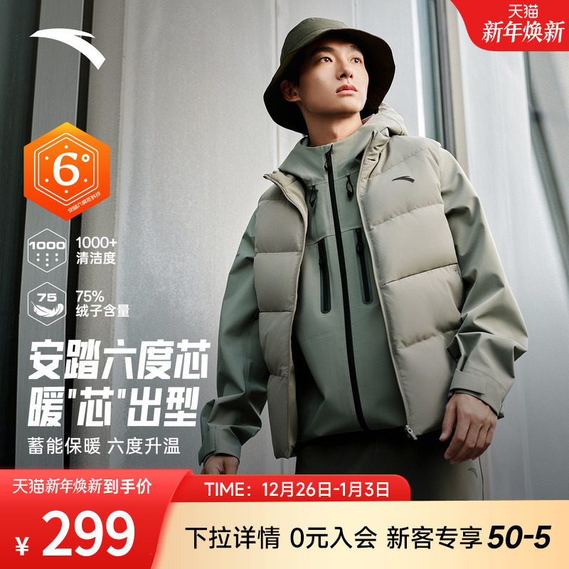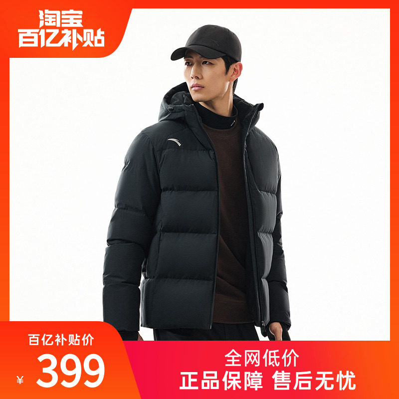 安踏羽绒服男2025冬季新款四防连帽面包羽绒外套黑色防风保暖风衣