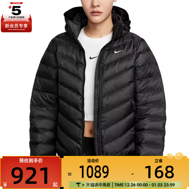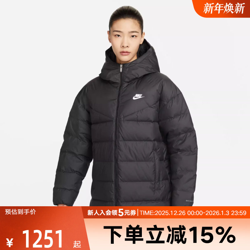 NIKE耐克女子黑色休闲宽松保暖连帽羽绒服外套HV5106-010