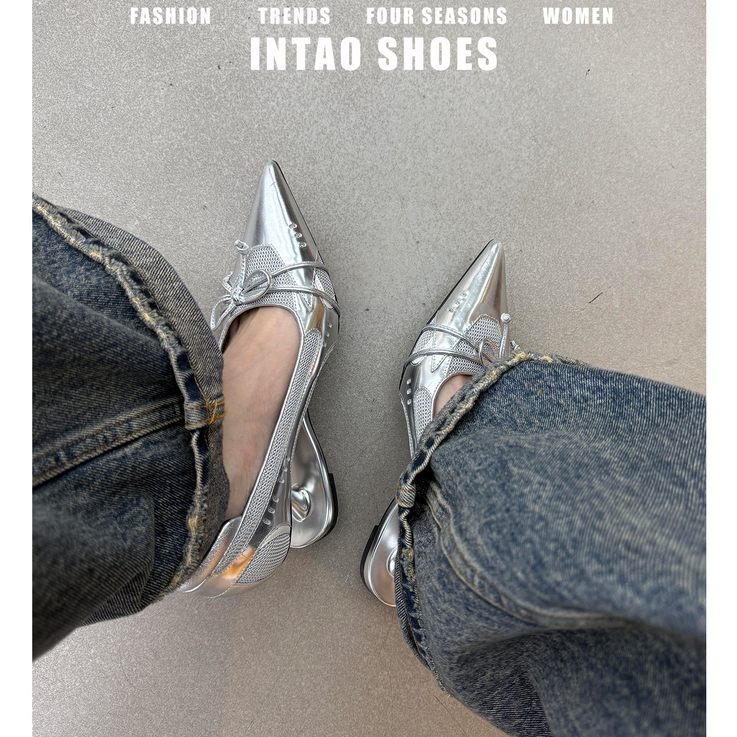 银色巨好看的玛丽珍单鞋女2026春季新款网面透气蝴蝶结尖头高跟鞋