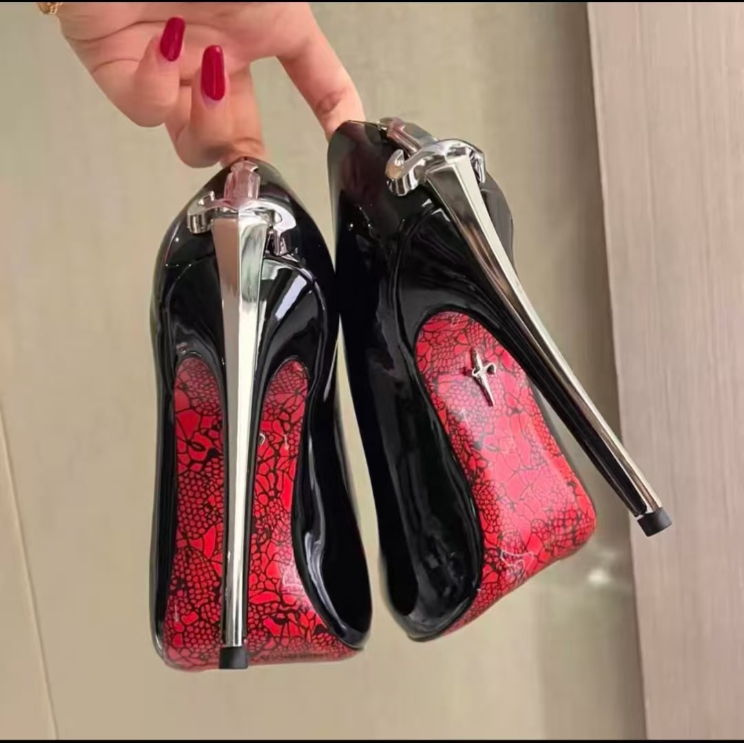 2026欧美新款银色利刃尖头红底高跟鞋黑色性感真皮绝美御姐风单鞋