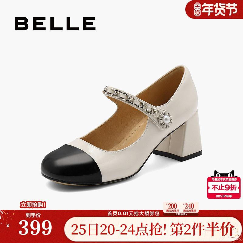 百丽女鞋子新款浅口单鞋粗高跟法式小香风银色玛丽珍鞋B5Q1DCQ4