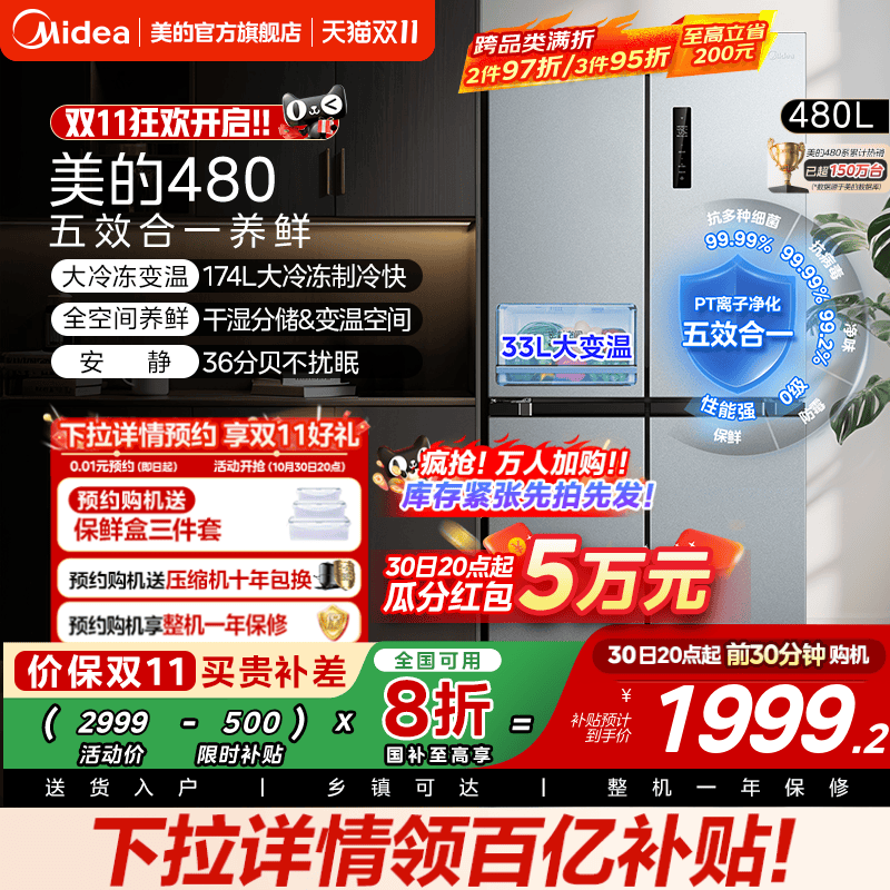 美的480L十字双开四门大容量一级风冷无霜薄嵌入家用冰箱换新补贴