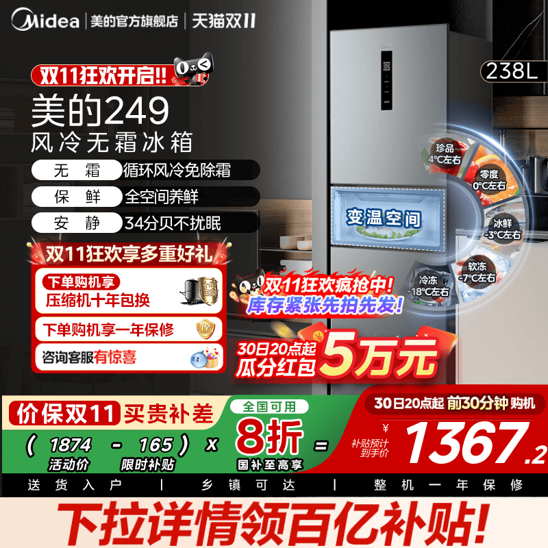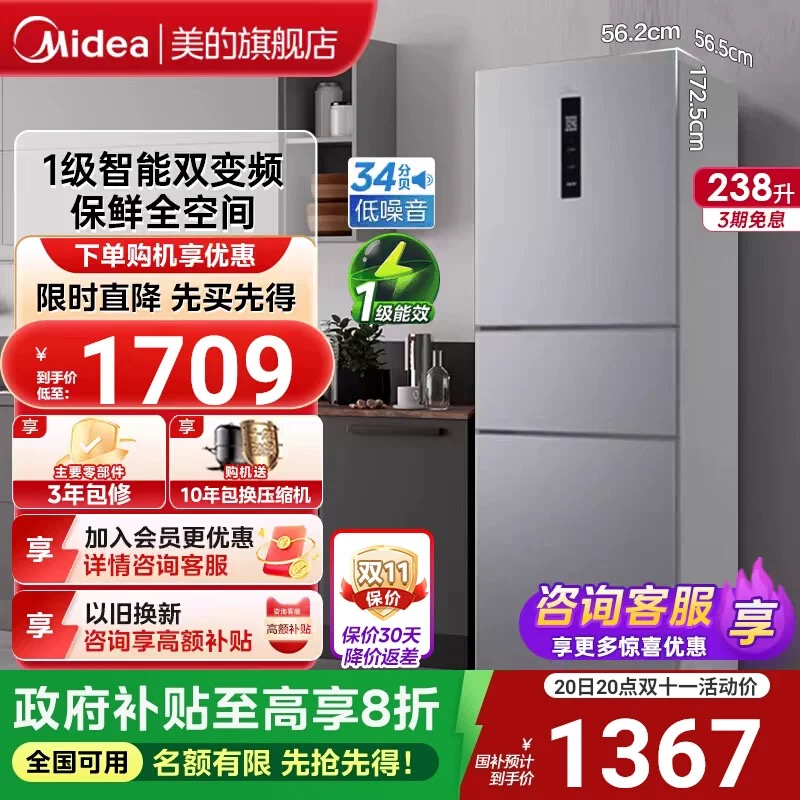 美的249三门冰箱风冷无霜大容量变频一级能效家用小型宿舍租房