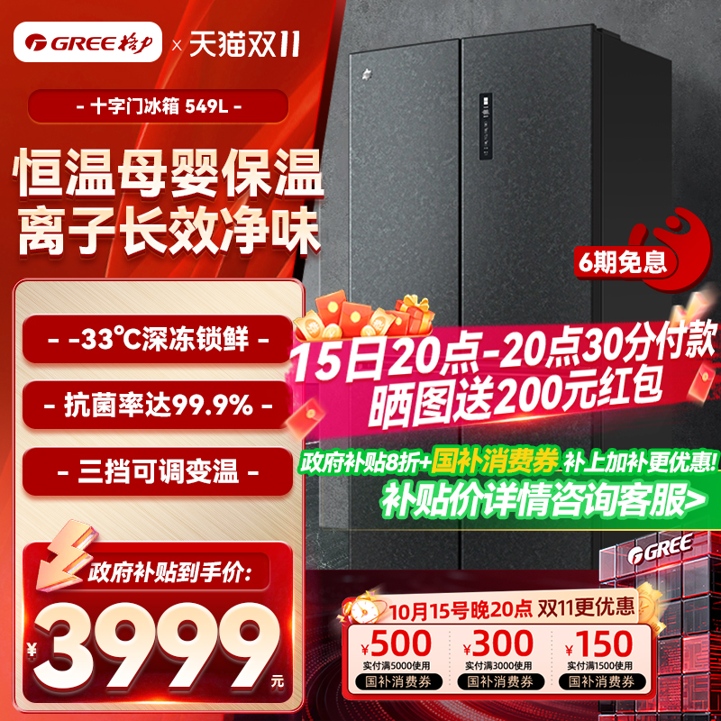 【双11特惠】格力晶弘549L十字门风冷无霜深冻储鲜母婴家用大冰箱
