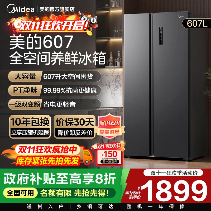 美的607L对开双开门十字大容量风冷无霜家用超薄一级变频606冰箱