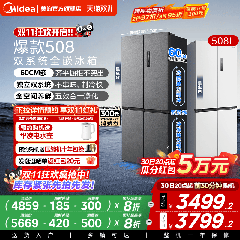 【双系统】美的508超薄零嵌入式冰箱十字双开四门家用大容量风冷