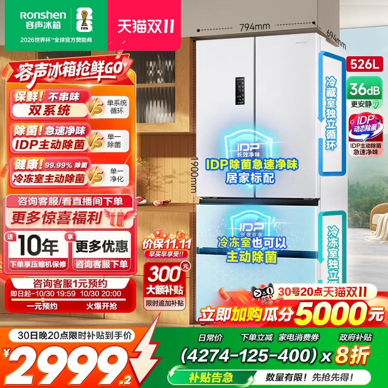 容声526L双净法式多门双开四门双系统循环无霜一级大容量家用冰箱