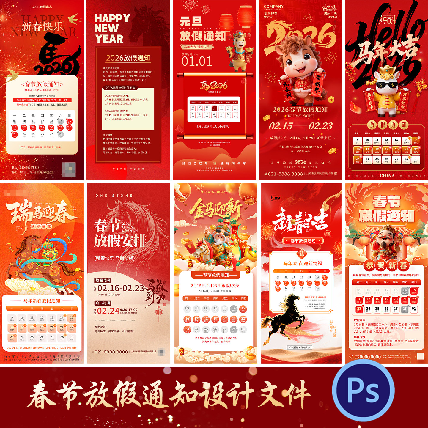 2026新年马年春节除夕正月公司企业放假通知公告海报PSD素材模板