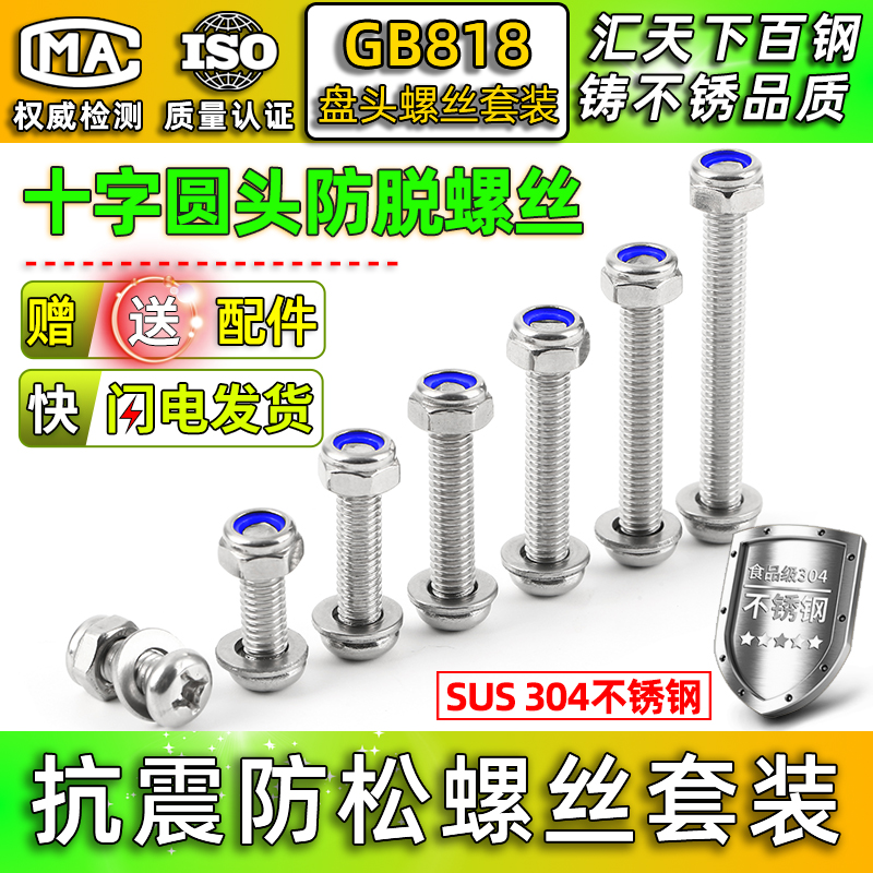 纯304不锈钢号牌螺丝防松十字盘头螺钉M134568抗震防脱落螺母套装
