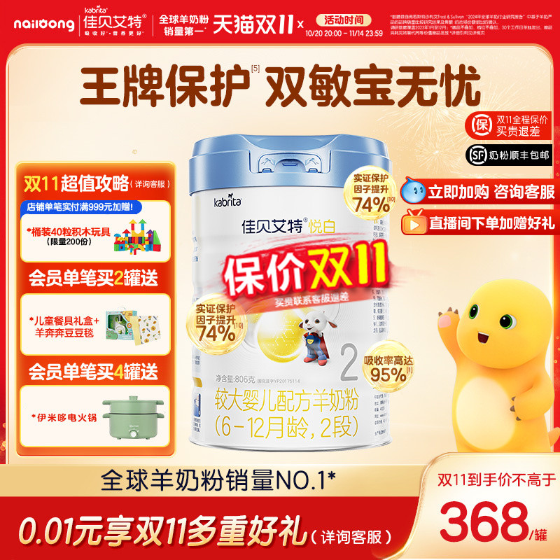 【双重乳铁蛋白】佳贝艾特 晶萃悦白婴儿羊奶粉6-12月 2段800g*1