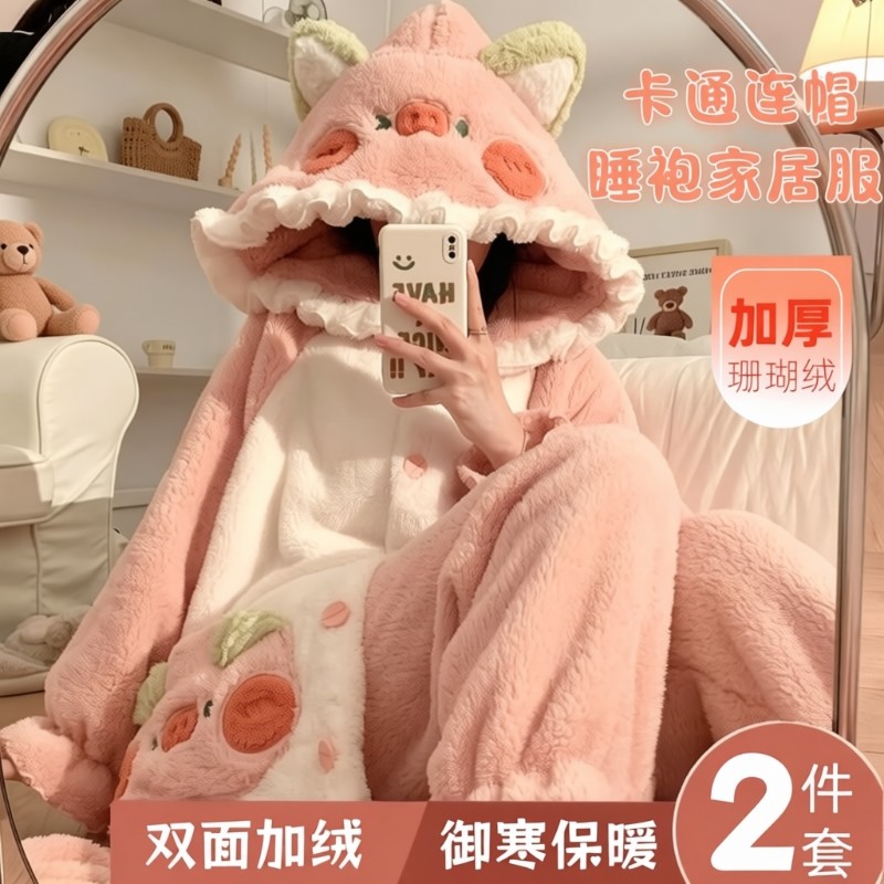 芬腾睡衣女士秋冬季珊瑚绒连帽套装保暖加绒法兰绒加厚家居服冬天