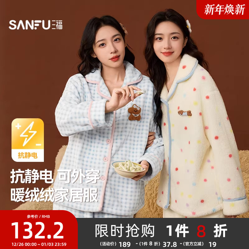 【抗静电】三福冬季格子法兰绒睡衣套装柔软宽松宅家外穿家居服女