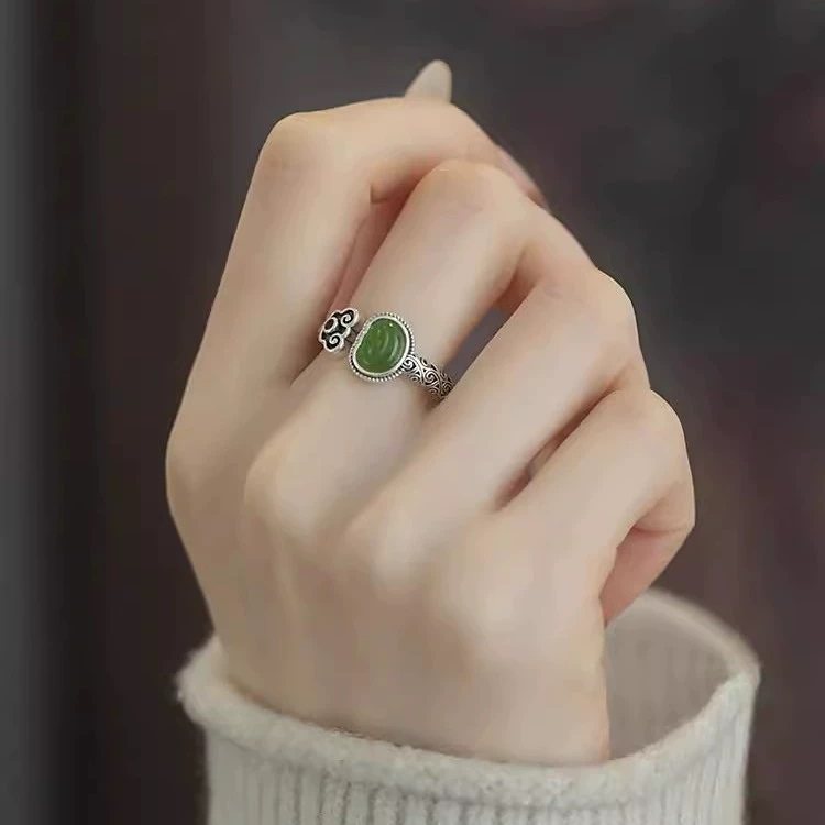小元宝925银碧玉戒指新中式小众设计镂空祥云纹开口可调节食指戒