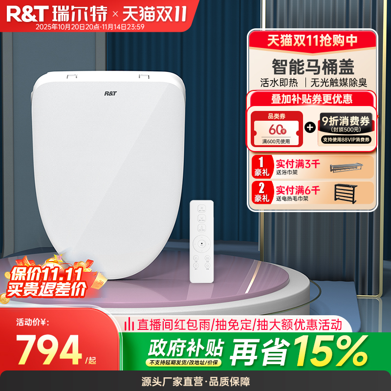 瑞尔特智能马桶盖UVD型即热式家用电动遥控加热座圈清洗坐便盖板