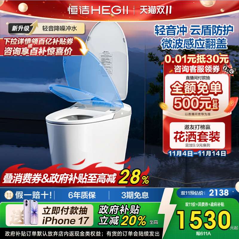 【下拉领百亿补贴】恒洁轻智能马桶坐便器泡沫盾感应翻盖家用611C