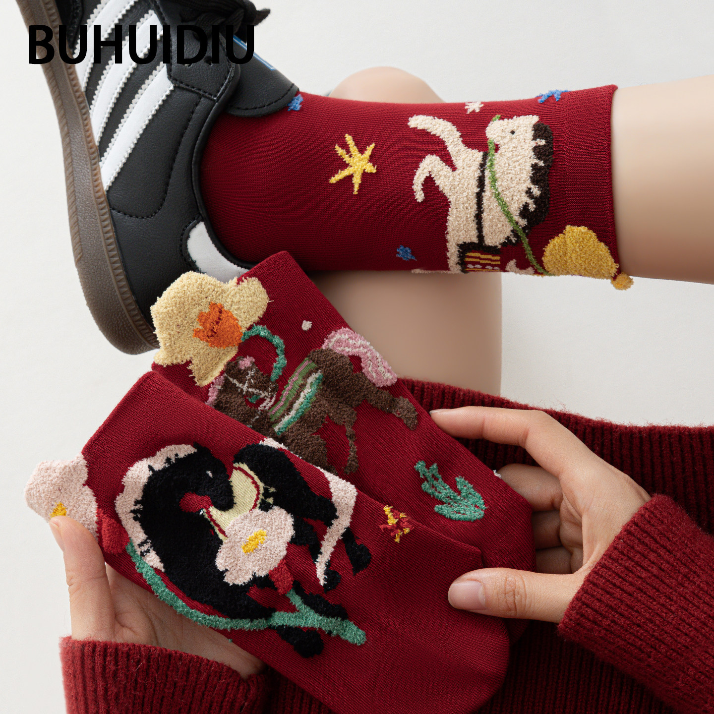 不会丢的袜子 马年红袜子女秋冬纯棉植绒卡通新年本命年红色长袜