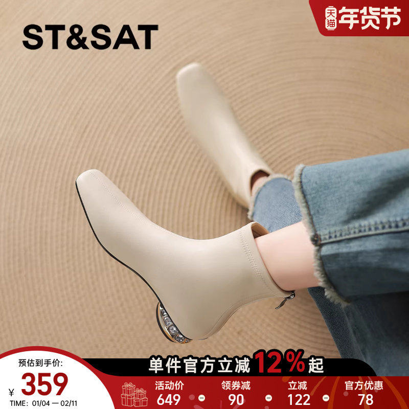 星期六方头白色小短靴2025新款女士女款女靴子瘦瘦皮靴子早秋冬季