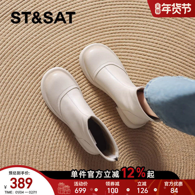 星期六女士白色靴子短靴粗跟增高马丁靴秋冬皮面保暖显身材中筒靴