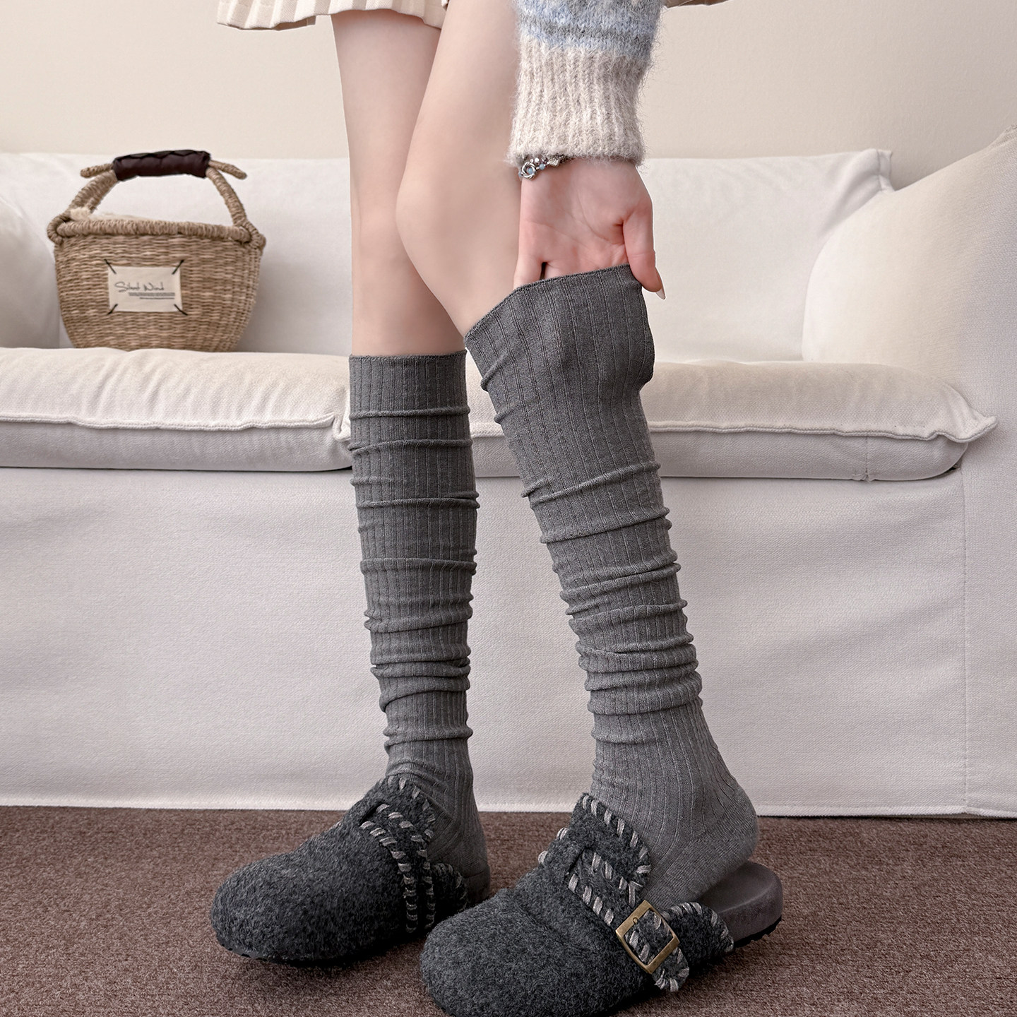 灰色过膝袜女秋冬白色小腿袜配靴子女士长筒袜冬季长袜女高筒袜女