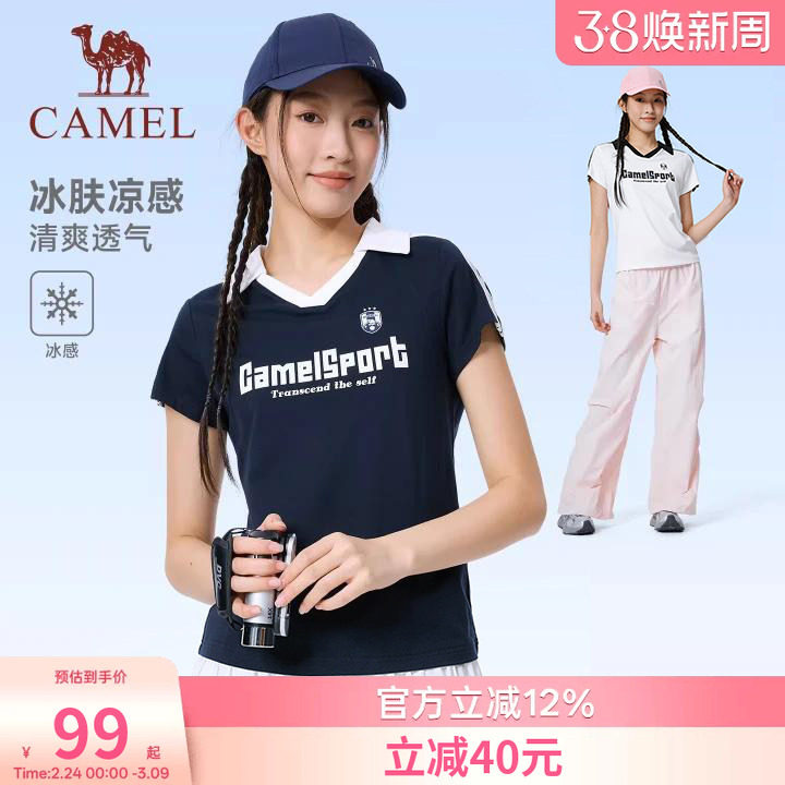 骆驼运动短袖T恤女2026夏季polo小v领冰感美式复古休闲翻领上衣